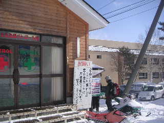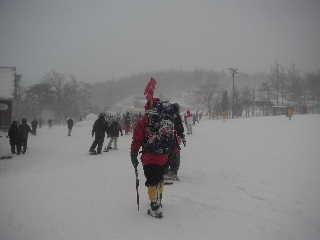 | 朝は5時に起きましたが雪がかなり降っていました。温泉と買い物でもしながらこのまま蔵王に向かおうかとしばらく空模様を見ていました。 だんだん明るくなってきたので用意し、出発することにしました。山頂にはガスがかかって全く見えませんでしたので、用意してきた赤布を持っていくことにします。 |