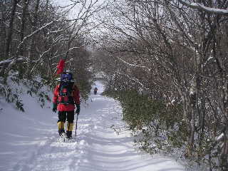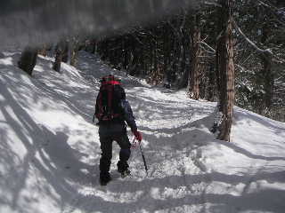 | 広々と気持ちのよい登山道。人が多いからでしょう、アイゼンもわかんも今のところ必要ありませんが、つけている人もいました。 | |