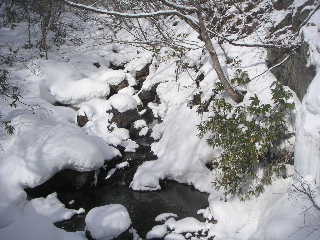 | 小さな橋を渡ります。雪が優しい表情をしています。 | |