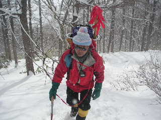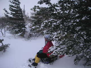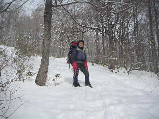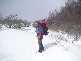 | 山スキーの人は泊まるそうで、いいな〜と思いつつ私達は休んだ後、下山することにします。 ワカンはしばらく着けたままでしたが、間もなく外し、あとは又ツボ足で歩きます。 |