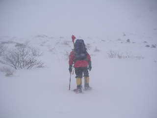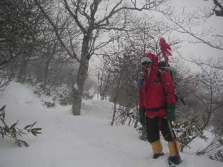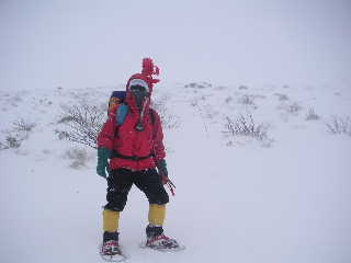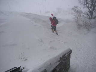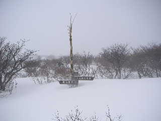 | 立てられた赤布の間隔さえ見えにくい視界だったので、途中にも持ってきた赤布を刺しながら行きました。ホワイトアウトの状態は変わりません。 13:18-22 峰ノ辻着。山頂まではもう少し、赤布もついているので行けそうでしたが、あいにくタイムアウト!強風でロープウェイは止まっていましたので、そちらへまわっても歩くようになりますからここで引き返すことにしました。無論悔いはありません。(でももうチョット早く出てくれば良かった!) |