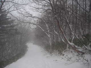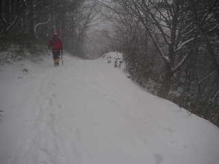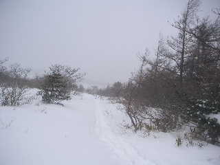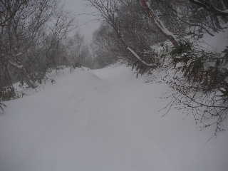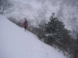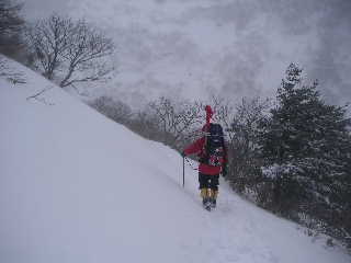 | 再び歩き出します。夏道は広かったのに今やトラバースになっています。もっと積雪量が多かったらどうなってしまうのでしょう。 | |