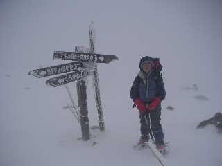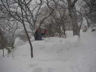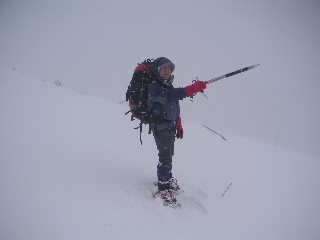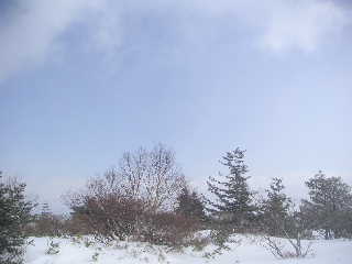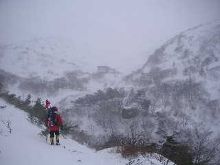 | トラバースしながら木の杭があるところまで来ました。山頂はアチラかな?などと指してしばし眺めているとスノボーラーが滑ってきて目の前を通ります。このガスの中よくやるよ!と感心(自分のことは棚に上げて(^^ゞ) 時間を気にしつつ、峰ノ辻まで行ってみることにします。そこで全く何も持たない空身の若い男女が下りてきました。わかんは小屋で買ったようでしたが・・・。私達が小屋に着いた時出発した二人です。山頂までピストンしてきたそうですが、こちらの心配をよそに「方向音痴じゃないから大丈夫!」とのたまいます。 |