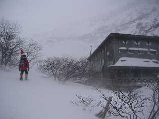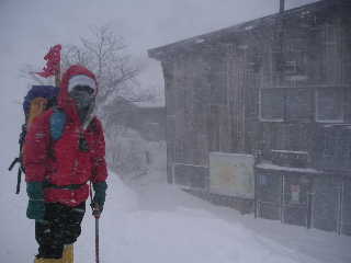 | 11:30-12:05 くろがね小屋に着いた頃はもうかなりのガスです。 ここで引き返そうかと思いましたが、山頂に向かう人、下りてくる人が何人かいます。アイゼンとワカンを装着し、もう少し行ってみることにしました。 |