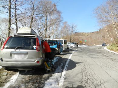 車道は雪もありませんでしたが登山口からはばっちり。早くも下山してくる人は(・・・って、もうお昼ですから^^;)、ほとんどの人がここでアイゼンを外しています。ダブルストック&ノーアイゼンの人もたまにいました。 我らが持ってきたアイゼンは12爪と6爪軽アイゼン。6爪は夏靴用に合わせてあり、夏靴はルーフボックスの中なので昨日と同じ12爪にしました。 この時で気温0、8℃。 |