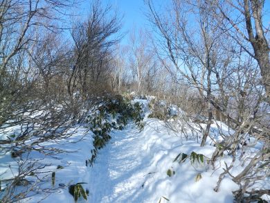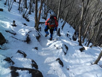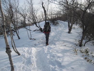 既にトレースはしっかりついています。この翌日は太平洋側も爆弾低気圧の発達で神奈川も記録的な大雪の初雪になりました。この辺りもがらりと新雪フカフカのラッセルが楽しめたことでしょう。交通マヒに遇わなければ・・・ |