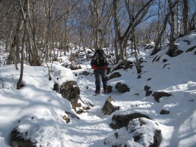 今回は歩く距離が短いので途中一休みしてノンビリ登っていきます。いつもは先に歩くトシちゃん、どうやら早く登ると駒ケ岳まで歩かされると思っている節があり、今日は私の前を歩こうとしません、ホント分かりやすい人です^^; バックに地蔵と落葉樹と・・・って、そこを強調するか・・!(^_-) |