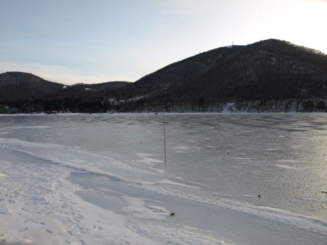 右手に地蔵岳を眺めながら。・・・いつかまた登ろうね、トシちゃん(^^ゞ 眼下に大沼(おの)。 水面にはワカサギ釣りのテントがいくつか。 氷の下が深い湖だと思うと見ているだけで足がすくみます^^; 地震による原発汚染でワカサギ釣りも釣るだけとか、どこかで読みましたが・・・ 赤城神社には帰りに参拝していこう。 |