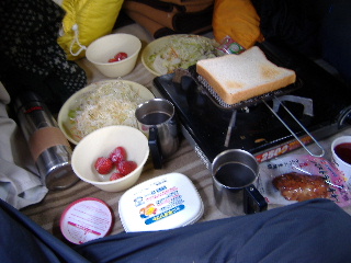 | 前夜登山口前の駐車場へ。移動中から夜中はずっと雨でしたが朝起きると晴天♪ 昨日はしっかり買出ししたので健康的な朝食です(^^ゞ |