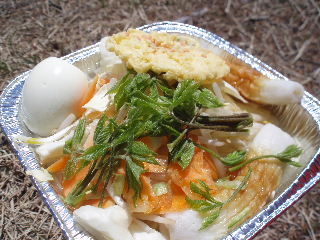 | 今朝、出発時は気温10度で寒く、うどんにしました。ところが山頂では30度!(笑) でもさすがに2000mを越えているせいか、爽やかな空気です。野菜たっぷり、卵、天ぷら、ちくわも入って美味しかったです♪それに昨日収穫のコシアブラも(^^♪ | ||||