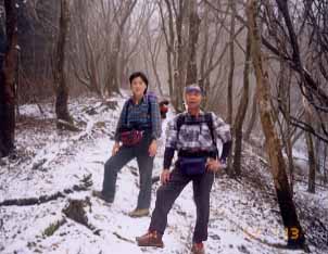 鍋割峠から雨山峠の間は鎖場などがあり、注意して通ればそれほど危険ではなく、面白いコース。そこで犬をつれて登ってくる家族連れとすれ違った。先頭をやってくる犬が、目の前で登れずクゥ〜ンと訴えるような眼差しに、夫が手を貸してやった。尻尾を振るワンちゃんに犬好きの夫は嬉しそう。安全な所まで登るとそのワンちゃんは振り返って家族を待っているという忠犬だった。飼い主のザックにはしっかりとザイルがくくりつけられており、犬を引っ張りあげるため一応用意してきたものだったとか。