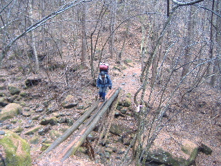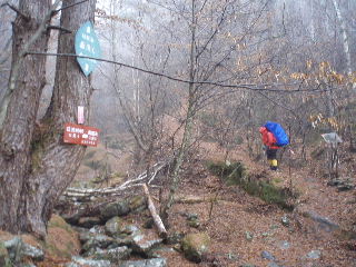 | 歩き始めて間もなくカズさんから「今、1740m・・」とメールが入りました。彼らは同ルート日帰りですからどこかですれ違うでしょう。 雨に濡れた丸木橋は滑りそう・・・気をつけて渡ります。 |