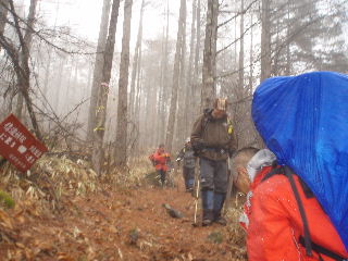 | 12:00-20 途中でパンと温かいコーヒーでお昼にします。雨が降っていますが静かな降り方で助かります。 トシちゃんは必ずザックカバーをします。sanaeは雪と思っていましたから、ザックカバーは持ってきませんでした。二人の性格が現れます(笑; トシちゃんO型、sanaeA型、どうみてもすることが反対です^_^; |