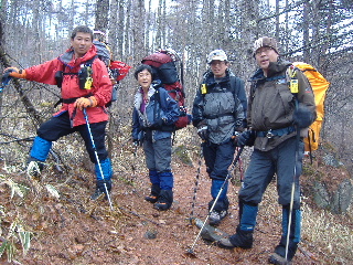 | 10:53 おや?まさか・・・・ と思ったらやはりカズさんたちではありませんか! 「もうピークを踏んできたのですか?」 すると雪が無いので登る気がしなくなったということでした(^o^) 岩小屋から引き返してきたそうです。岩小屋?地図には出ていませんで・・・(古いです)。 蓼科山以来の再会、しばしそこで立ち話。話が弾みます。シェフさんは今回「初めまして」でした。 |