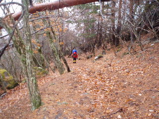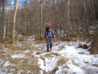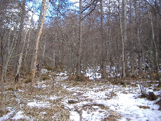 | 11:15 名残惜しいですけどお別れです。 ラッセル要員は下山して行ってしまいました(^o^)/ せっかくみなさんスノーシューを担いでこられたのに、雪が無いのでは出番がありません・・・か?(笑) |