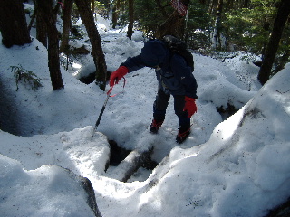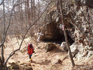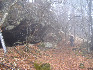 | 12:39 岩小屋。この岩の中で休憩する気分にはなれませんが、なるほど〜なネーミングです。 カズさんたちはここで引き返したのですね。確かに全く雪がありませんでした。でもこの先徐々に雪道になっていきます。期待したフワフワパウダーではありませんが・・・ |