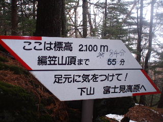 | 丁寧な標識があります。1590m、ここでPROTREKの標高を合わせます。編笠山頂まであと2時間10分ですか〜♪ ザックが重いですからもう少し時間かかるでしょうけど・・このコースタイムかなりシビアです。夏道を軽い荷物でかなりハイペースのタイムに思えました。 |
