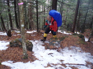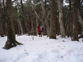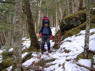 | 樹林帯に入るとようやくホッとしました。テントまでもどり、テント撤収します(12:00-13:30) ザックやタオルなど濡れたものはゴワゴワでパッキングが大変でした。ザックの紐調節も凍って硬くなり、調整が大変でした。 インナー手袋の右手中指と薬指の先端が破けていたため指先だけ軽い凍傷・・・インナーといえども(インナーこそ)気をつけねば。 |
