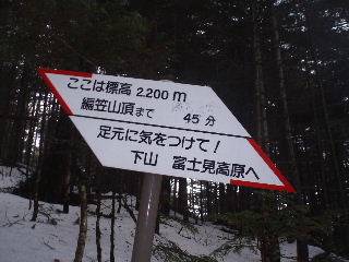 | 標高2200m。山頂まで45分!先ほどの標識から10分ですが、20分かかりました^_^; フゥフゥ・・・ | |