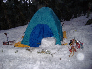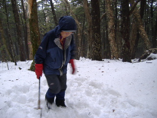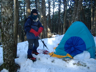 | H20年1月12-13日(土日) 天気;初日雨、二日目晴れ Member.2人 【コ ー ス】(〜は歩、休憩時間含む) 12日:富士見高原ゴルフ場登山口(1350m)9:56〜分岐10:42〜岩小屋12:39〜しゃくなげ公園手前でテント設営16:00 【休憩含む所要時間約6時間。】 13日:テント場9:15〜編笠山山頂10:35-11:16〜テント場(撤収)12:00-13:30〜岩小屋15:00〜富士見高原ゴルフ場登山口(1350m)16:00 【休憩含む所要時間約6時間45分。】 |