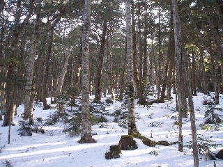 | テント場から10分ほど登るとシャクナゲ公園と書かれてました。雪で分かりませんが、右の方に矢印があります。シャクナゲはどこ?と捜しましたがその辺りはシラビソばかり。 | |