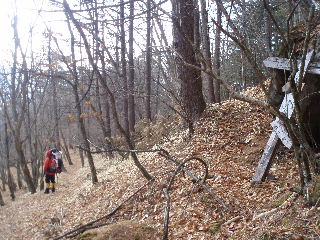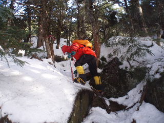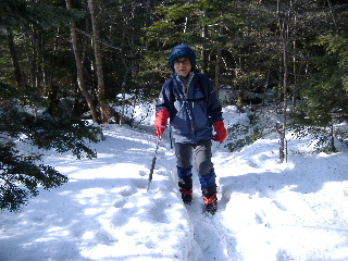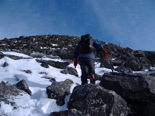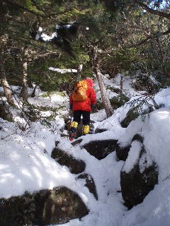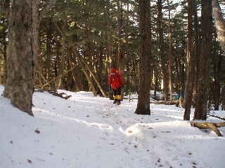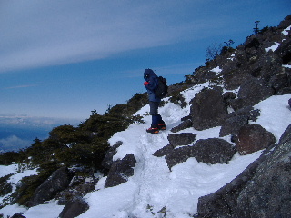 | 登りがきつくなってくるとさすがにノーアイゼンでは厳しくなりました。早々に装着することにします。 そこへ6時ごろ観音平から登ってピークを踏んできたというご夫婦(?)が下りてきました。「(アイゼンが必要なのは)あと少しですよ」と言われたお二人ですが、アイスバーンを避けてコースアウトの下山。登りはそういうわけに行かず、しっかりアイゼンをつけて、登山道を行く事にしました。やはりつけるべき登山道でした。 |
