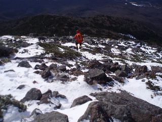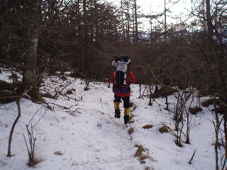 | ようやく雪。人気のあるルートなのか、踏みしめられたトレースはアイスバーン状態。 | |