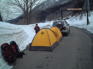 前夜発で登山口に着いたのは夜中の2時過ぎ。関越に入るまでの環状八号線の工事渋滞で予定よりかなり遅い到着となった。車を置けそうな場所にテントを張って2時半に就寝。しかし貨物の高架下ですさまじい轟音に一同びっくりするやらがっかりするやら思わず笑ってしまった。それでももう動くわけには行かず子守歌代わりに寝る事とするzzzz・・・(夜中でも数回通過するのでこれから行く人は場所選びを慎重にして下さいね^-^;)