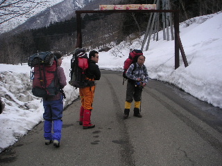 荒沢山は充分日帰りの出来る山ではあるが、今回は雪山をゆっくり歩き、夫の希望で雪洞堀を楽しむのが目的だった。だから慌てて起きることもなく7時に起きて、食事と支度を済ませ出発したのは8時半過ぎ。道路でのテントは登山キャリアの豊富な斉木さんが一番慣れている?はずなのに何故か眠れなかったという。そんな神経を持っていたのだとはじめの内は茶化していたが、骨折後のリハビリ中でもあり、とにかくゆっくり行こうと言いつつ、内心は皆ホッとしていたりして。実は彼にはこれくらいのハンデがないと、私達には付いていくのが大変なのだ!