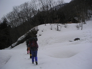 林道はラッセルすることもなく、締まって歩きやすかった。まもなく早稲田大学の山荘という建物があり、そこからカドナミ尾根へ行ける。荒沢尾根にしようか迷ったが、リーダー(斉木さん)判断でひとまずルートが確認出来たカドナミ尾根へ行くことになった。雪洞という目的があったのでテントをやめてツエルトにしたため、両方の尾根を見比べて、その少ない積雪状況に雪洞堀の不安を覚えつつ。