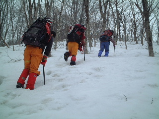 食後荷物をまとめ、ザックは4人で二つ。必要なものだけ持ち、残りは雪洞の中に残して山頂へと出発した。今回初めてアイゼンを着け、トップは斉木奥さん。雪質はまだ締まっていたので歩きやすく大きな雪庇では無かったが、慎重に歩を進めていった。ウサギの足跡がしっかり続いており、私達はなおもその内側を歩いていった。