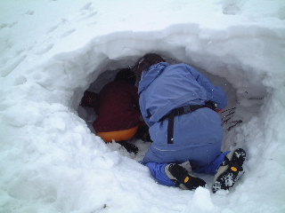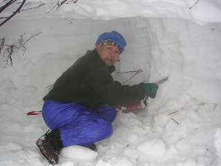 持っていった用具はショベル二つ。そして極めつけは二つのスノーソー!驚く無かれ、このスノーソーは100円ショップで購入したもの。山道具屋さんでは少なくとも2500円以上はする。高いものはさらに倍近い価格だ。めったに使わないものだからと私の知らぬ間に夫が買い求め、雪のブロック切り出し用にわざわざ目を粗く加工していたのだった。これがすごく役立った。奥に掘り進むほどに雪は固くなり、ショベルだけでは歯が立たなかった。それが面白いほど大きなブロック切り出しができる。上手くいってみんなの喝采を浴び、夫は大満足であった。雪洞堀りの功労賞である。