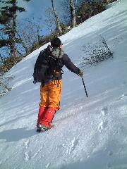 下山を始めればすぐ西側の風景しか眺められなくなる。それでも時々立ち止まっては眺めを楽しんだ。下りでは7,8人の登山者にも遭遇し、足拍子岳方面から荒沢山に向かう人も途中から見えた。昨日の静かな山は一瞬賑やかな雰囲気だった。登るとき締まっていた雪面は大勢の登山者に踏まれ、気温が上がっていたこともあって、ザラメ状にザクザクしていた。下りは緊張するだろうと思った場所はいくつかあったが、思ったほど恐怖心はなかった。一箇所心配だったところでザイルを使って下りたが、当然安心感はある。