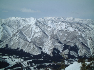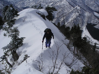 徐々に高度を上げていったが、30分で山頂に着くほど甘くはなかった。滑ったらはるか下まで滑落しそうな場所はいくらでもあったし、急斜面やヤセ尾根、更には両脇が切り立った岩場など、同ルートを下るのは恐怖と思える場所ばかりの連続であった。アイゼンとピッケルなしではとても登れない。しかし振り返ればタカマタギから平標山に続く白銀の山並みが広がって、とっても素晴らしい。