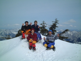 かすかに残されていた踏み跡はいつのものか?初めから急で所々雪が滑り落ち、土や笹が表れて登りにくい。それも数カ所で無くなり、やがて雪を踏みしめていくが急登は続いている。この日は最後までアイゼン無しで行った。この時期枯れ木のような雑木林は見通しがよい。関越道が見え騒音がいつまでも鳴り響いてきて、交通が便利な反面、魅力半減の思いもする。しかし高度がどんどん上がるたびに二年前に歩いた棒立山など、その周りに広がる山並みを振り返る楽しさが増す。登っている目線にはマンサクの花が気持ちを和ませてくれる。急ぐ日程ではないので何回も休憩しながらのんびりと登っていった。と言いつつ、本音は展望を口実に休みたい!(^o^)のであった。登っているときは苦しかった筈なのに、こうして書いていると、なぜか苦しいことより楽しいことばかり思い出されるのが不思議だ。みんなの笑顔や汗の噴き出した顔を思い出すと、辛かったことなど無かったかのように思える。