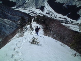 やっと山頂かと思ったら足拍子岳から荒沢山へ続く尾根だった。しかしその場に立った時の感動は山頂と変わらない。目の前に今まで見えなかった東側の展望が一気に目に飛び込んできたのだから。しばらく呆然と見とれていた。足拍子岳への尾根は登ってくる途中から見ているとちょっと足を伸ばしたく思えたが、そんな生やさしいルートでは無かった。それなりの技術を持っていないと難しそうだ。足拍子岳に背を向けて、そのまた高みへと足を乗せると更にその先に丸い小さな頂がある。そこへ行くには2〜3mほどだが、それこそ細いヤセ尾根を通らねばならない。気を引き締めて慎重に通過。