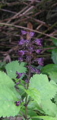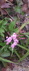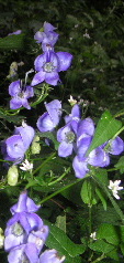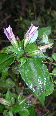 ひとまずお先にと挨拶して出発。しばらくは林道で話しながら並んでいく。かつては使われていたらしい草ぼうぼうの林道を何回か横切っていくと、また登山口が現れた。そこから細い登山道になっていく。かつてはここまで車で入れたのだろうか? 登山道はしっかり分かるが、下草に覆われていた。リュウノウギク、アキチョウジ、ツリフネソウ、ミゾソバ(ウシノヒタイ)、トリカブト、ミズヒキ、キンミズヒキ、アキノキリンソウ・・・と、秋の花のオンパレード。初めて見る花や、名前の分からないものもたくさん咲いている。そしてリンドウが見られるようになると、それから山頂までずっとリンドウ街道が続き励まされる。