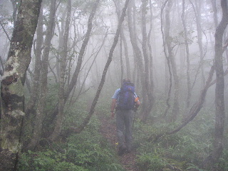 亀足の上に写真を撮りながら行くものだから、思ったより時間がかかってしまった。巻くように歩いて行けば間もなく小荒島岳分岐だが、なかなかたどりつかない。ひとまず休憩して歩き出すとその分岐は近かった。この小荒島岳から荒島岳を眺めたかったのでこのコースにしたのだが、濃霧ではかなわず。行きは通過して帰りに寄ろうということになった。ここもブナ林が幻想的。三日間、ガスに包まれた幻想的なブナ林ばかりだった。