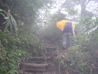 | 最終日は荒島岳、いよいよ百名山99座目となった。残るは白山ひとつ。近いのだから一緒に登っちゃえばいいのに・・・という声が聞こえてきそう(私の内なる声か・・)。しかし一日で登るというわけにもいかない。というより時間をかけて登り(いつもやん・・)、山中でゆっくりする予定だ。 ということで先ずはその前に荒島岳。丹波のたぬきさんのHPを参考にさせていただいて中出コースを行くことにした。夜、登山口まで移動したものだからR158の中休から曲がっていったあと、入り口が暗くて分からず行ったり来たりしてしまった。ようやく標高400m(ん?400m?ここで標高400mということは1100m以上も登ることになるではないですかぁ・・(@.@;;)、みずごう登山口に着き、テント設営。百名山となると誰かしらご同輩がいるものだが今回は珍しく私たちだけだった。勝原(かどはら)の方から登る人の方が多いのだろうか? 6時ごろ起床。テント撤収して簡単に朝食を済ませた。したくしていると軽トラが一台やってきた。男性二人、しきりと携帯で連絡を取り合っている。誰かと待ち合わせをしているらしい。話すと後から小学生が90名ほど来て一緒に登るとのことだった。ウヘッ!大山に引き続き又だ!?