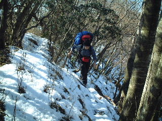| 急登から平坦な山道になったところで雪が出てきました。少し前に降った雪のようです。それにしても今年は雪が少ない・・・ | |