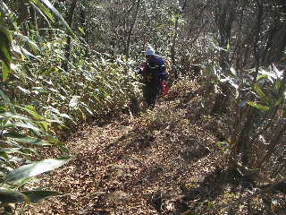 | 笹は刈られ、登山道が整備されています。ゆっくり登って行きました。 | |