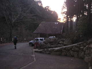 | 山荘から5分程で広場があり、ここが愛鷹山への登山口。通常はここまで車が入れるようです。停まっているのは工事の人の車でした。 | |
