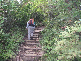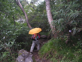 下り始めて1時間足らずでついに傘をさしますが、 あとは気を遣うような所もありません。 でも次々にツアーのグループがやってきて、待つこと度々。 多い時は30人ほどのグループが数珠繋ぎです。 |