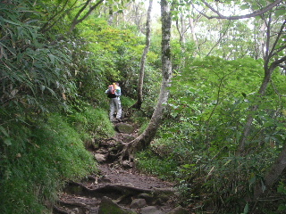 | お天気が不安定なので今回もショートコースの八方台(磐梯山ゴールドライン)から。ゆっくり起き、ラーメンで朝食を済ませます。出発は8時近くになり、広い駐車場にもどんどん車がやってきました。マイクロバスの団体と一緒になるかと思ったら猫魔ヶ岳だったようで、弘法清水までは人と会うこともなく静かでした。しかし下山の頃には多くの団体とすれ違いました。百名山で人気ルートだけに混みますから、出発は早朝のほうがいいようです。 |