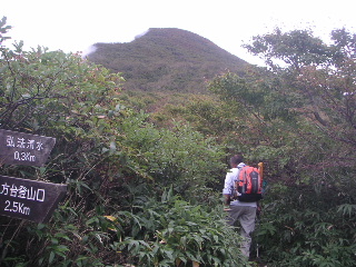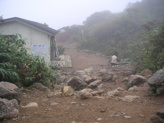 | 弘法清水まで300m。前方に磐梯山山頂ですが少しガスが出てきたのでしょうか? ここからはお花畑を経由して弘法清水に行けるようですが、時期ではないのでそちらはパス。 |