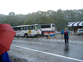 | 12:15 八方台に着くと車の量は更に増え、大型バスも3台停まっていました。先ほどのすれ違い、納得です。 片付けていると、雨脚はさらに強くなりました。私たちはいい時に下りてきましたが、今登っている人はお気の毒です。 |