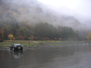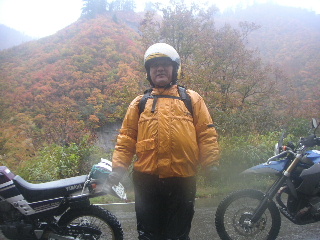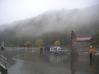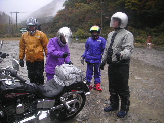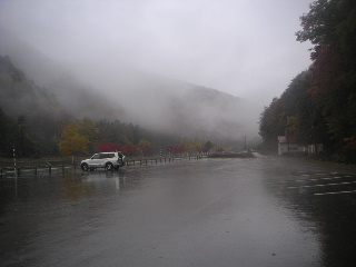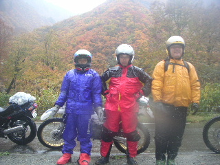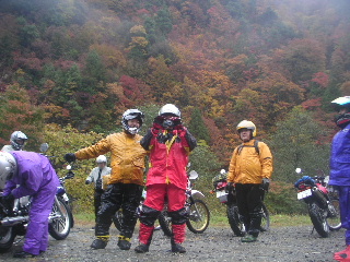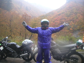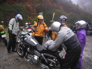 | そして奥只見で。 紅葉の素晴らしさは最高潮〜。 ・・・が、赤や黄色の色とりどりに〜♪と 紅葉しているのは 我らだ〜!!!(^^♪ ガスっているとき、悪天候の時のバイクは目立つ服が大事です(山と同じだ・・・)。 |