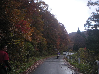 | 逞しい男達は(失礼、女性もお一人いらっしゃいました)、ひたすら走りますが、素晴らしい紅葉にも目を奪われ、休憩しながらしばし堪能! ここ、桧枝岐の紅葉はまだ序の口。 | |