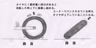 ホィールやタイヤは円になっていて、重さは均一になっているものは少なくどこかが重くなってしまっている。その均等になっていないタイヤが回転すれば、必ず振動する。前後には固定されているが、上下はサスがある為、タイヤが上下運動をおこす。
