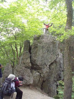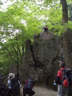 | 岩茸石。帰りはここから別ルート(滝ノ平コース)で下ります。トシちゃんが岩茸石を見に行っているようですが・・・ | ||||